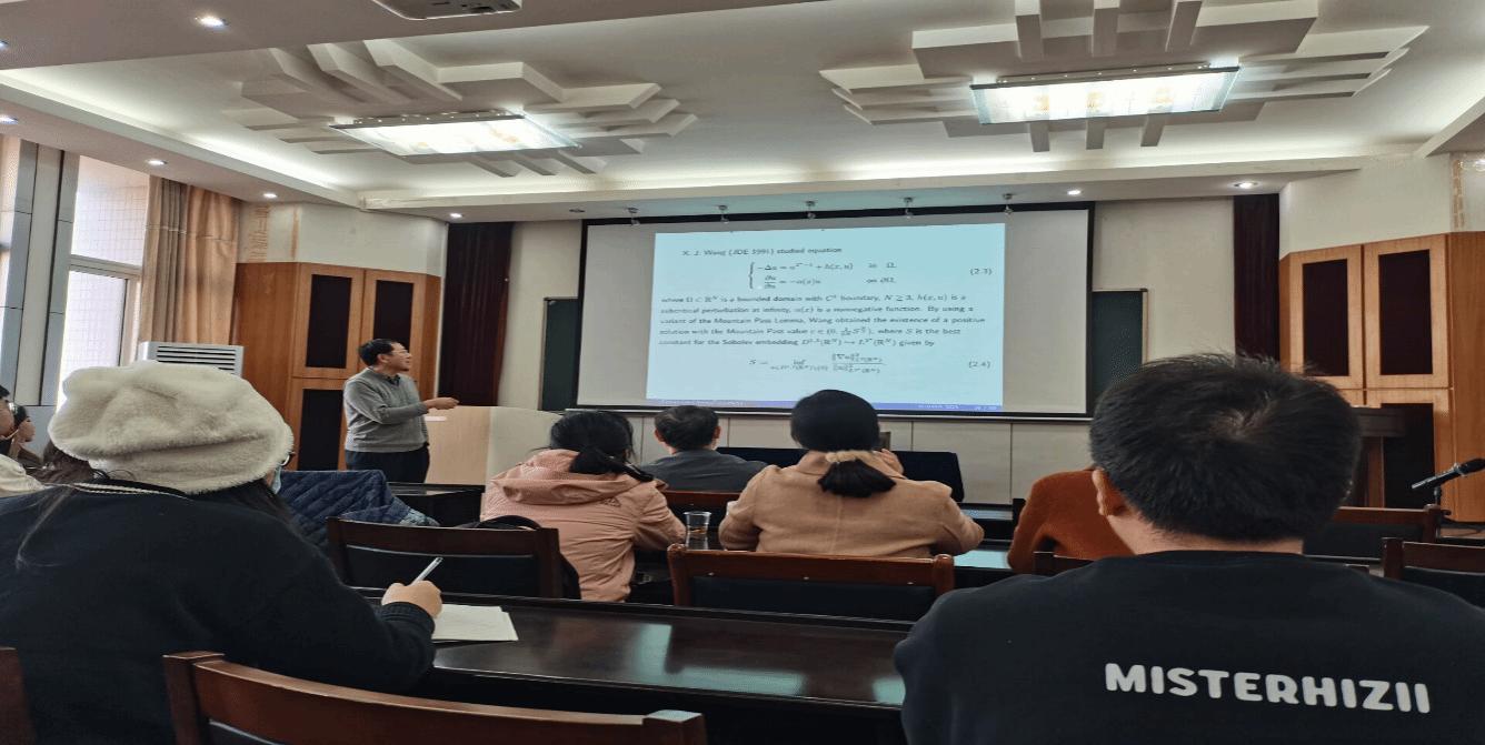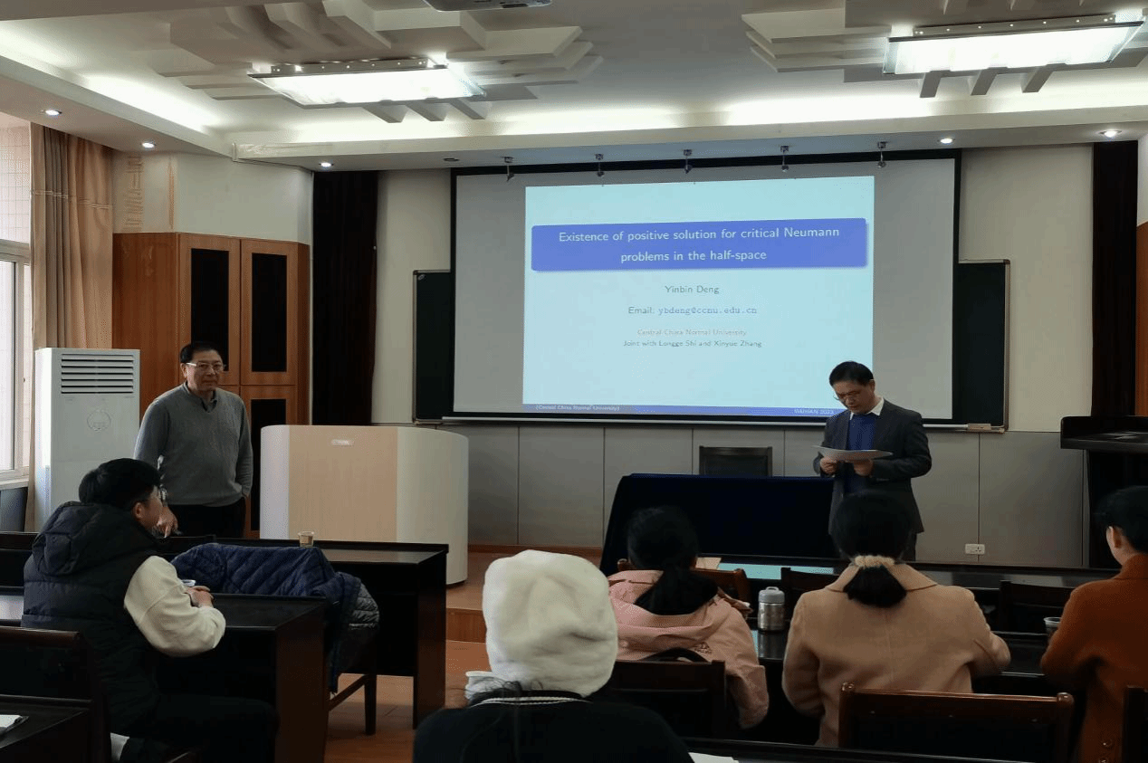 报告过程中,邓引斌教授向参会师生介绍了近期的研究工作,关于在上半空间的临界Neumann问题。邓引斌教授从经典的Brezis-Nirenberg问题出发,随后介绍了与之对应的p-Laplace问题、Hardy问题、双调和问题。邓引斌教授幽默风趣地讲到,方程的算子稍微变动一下,看似好像很简单,其实它可能会有本质的困难出现。邓引斌教授将这些问题目前已有的结果和仍然存在的公开问题详尽地讲述给参会师生,并鼓励大家尝试解决这些公开问题。