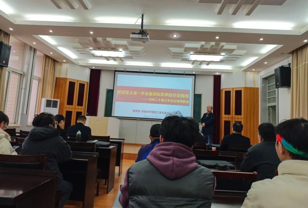 武科大网讯(通讯员金雨欣)为推动申慱官网干部师生全面学习、全面把握、全面落实党的二十届三中全会精神,坚定不移把党的二十届三中全会提出的目标任务落到实处,申慱官网于12月12日下午于22515开展《新征程上进一步全面深化改革的行动纲领》主题宣讲。本次宣讲人为学校“双带头人”宣讲队成员、申慱官网系统科学部党支部书记徐树立,学院50多名师生党员参加了此次活动。