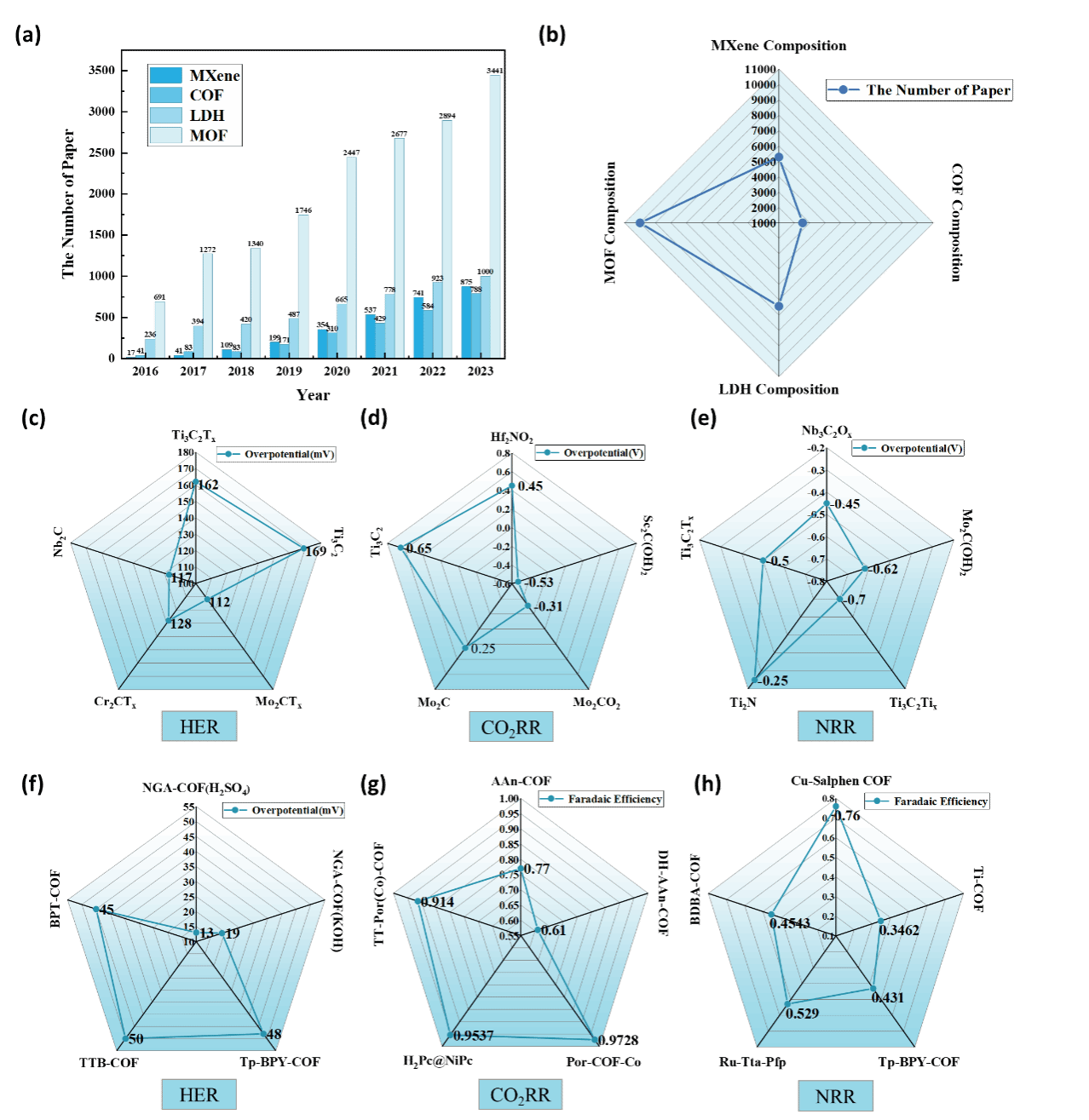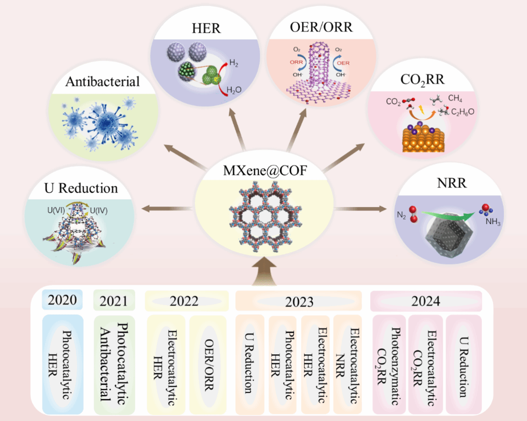 MXene具有高导电性、良好的亲水性和可调控的表面官能团,使其成为优异的电催化材料。然而,MXene在光催化领域的应用受限于其较弱的光吸收能力和易氧化降解的问题。COF具有高比表面积、可设计性强和优异的光吸收能力,特别适用于光催化应用。然而,COF通常存在导电性较差和光生载流子复合严重的问题。MXene和COF的结合能够弥补各自的缺陷,形成高效的MXene/COF异质结,充分发挥其在光催化和电催化中的协同作用。