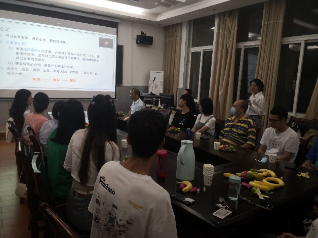 然后,22级新生们依次进行了自我介绍和对本研究组课题的认识。22届毕业生余纪成和20级研究生姜楠、聂娜、潘前分别进行了学习经验分享。非全研究生余纪成是高中教师,两位孩子的爸爸,他挤出所有能利用的时间,勤奋学习、努力钻研,三年间发表了五篇论文(含三篇SCI)。他从珍惜时间,多读论文,多写论文三方面分享了自己的科研之路,深刻体会到看书不如读论文,读论文不如写论文。他说科研虽苦,但他苦中作乐,即使现在毕业了,自己还会坚守科研这条路,一直走下去。姜楠今年发表了一篇影响因子6.5的SCI论文,她说,好文章是需要反复修改、琢磨的,初稿就像毛坯房,只有经过不断充实、提炼,才能得到精装修房。聂娜和潘前从文献阅读、加强讨论、潜心研究等方面进行了分享。