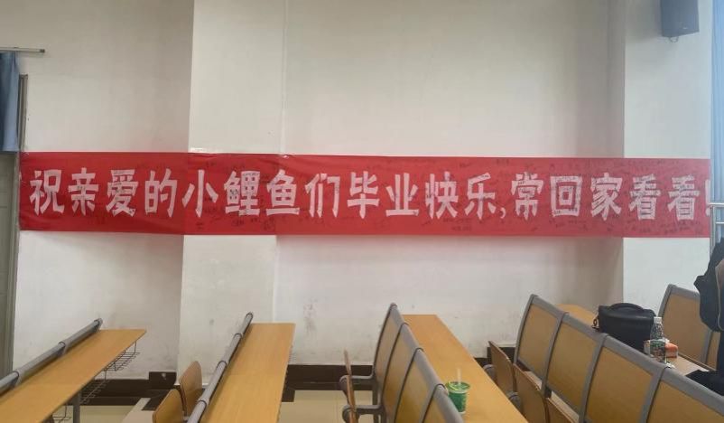 本次毕业典礼上设置了一块特别的横幅,除了“亲爱的小鲤鱼毕业快乐”的字样外,上面还写满了本届毕业生的签名及祝福。工力2001班学生黎坤孟感叹:“都说毕业快乐实际上我心里感到很不舍舍不得朝夕相处的老师和同学们。信计2001吴卫铭留下了自己的祝福:“祝全体毕业生都能鲤跃龙门,书写自己的华章,践行青年担当新质生产力时代的建设添砖加瓦