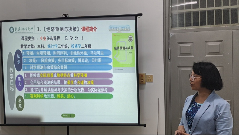 主编三部教材、指导两项大学生创新创业项目、主持武科大本科生国际化课程一门、校课程思政教学竞赛三等奖获得者龚谊承老师,简述了《经济预测与决策》课程的思政元素,并以“博弈论引述”为例,为大家展示了思政元素在课堂教学中的渗透。