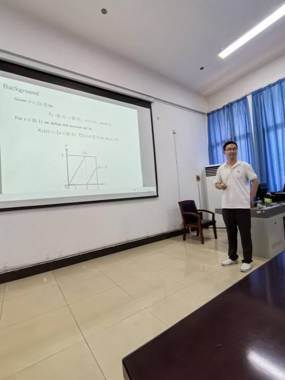 报告中,孔老师介绍了近两年的重要工作。给定(1,2]中的beta,设T为单位圆[0,1)上的beta变换。对于[0,1)中的T,设K(T)为由所有x组成的幸存者集,其在T下的轨道从不落在开区间(0,T)内。Kalle等人证明了Hausdorff维数函数dim K(T)在t上是一个非递增的魔鬼阶梯。因此,存在一个临界值,当t超过该临界值时,dim K(T)变为0。在这次报告中,孔老师描述了这个临界值并分析其有趣的性质;此外还完整地描述了相关的符号动态。